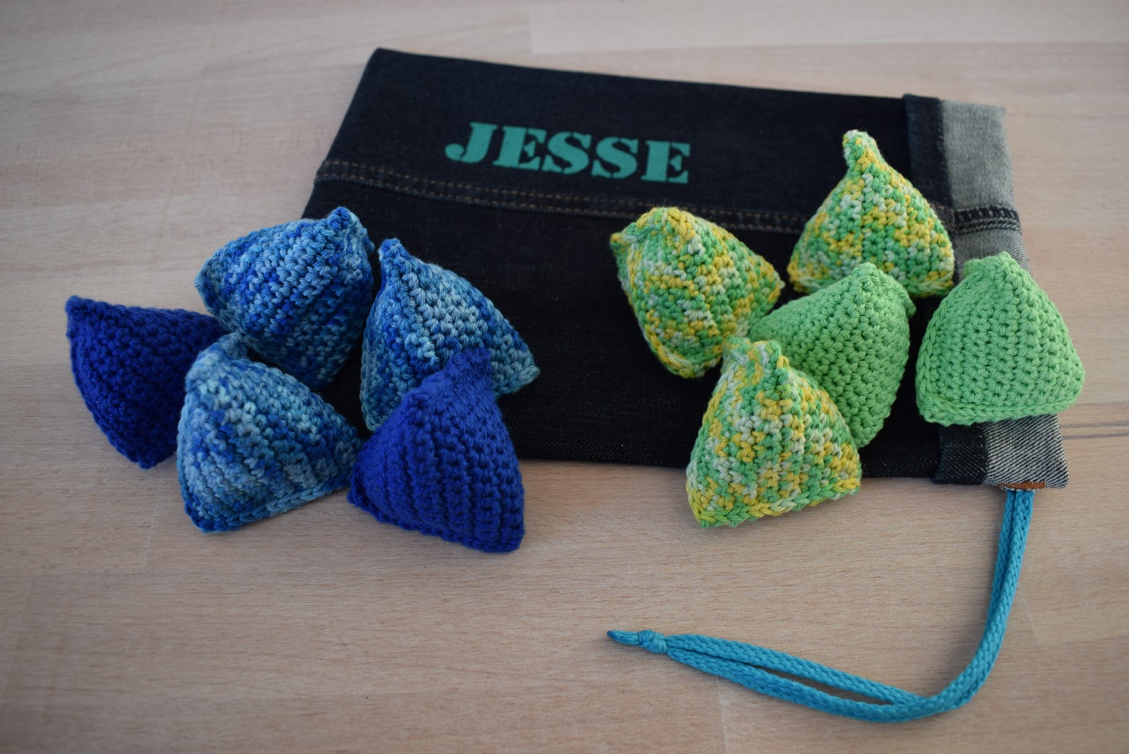 Voor een jarige job die 5 jaar werd, haakte ik blauwe en groene PIP bags. Van een pijp van een oude spijkerbroek naaide ik een tas, zodat hij de PIP bags makkelijk mee kan nemen en handig op kan bergen.